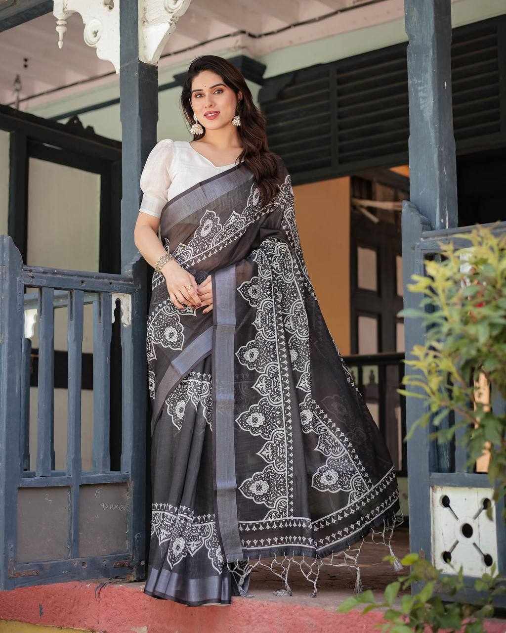 Saree Fabric: Premium Linen Cotton with elegant Silver Weaving Patta and beautiful digital print